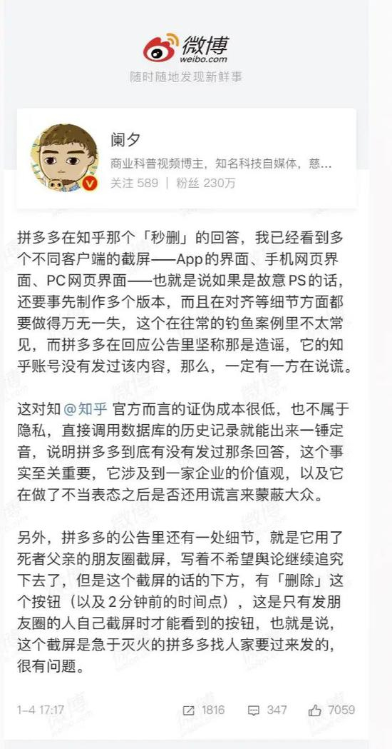 回应中,拼多多一方面截取了“润肺”父亲提供的一张朋友圈动态,表达了对公司和同事的感谢,并称:“恳求大家不要让**卷入舆论是非中。”另一方面又否认了知乎截图真实性,最终引来知乎打脸。