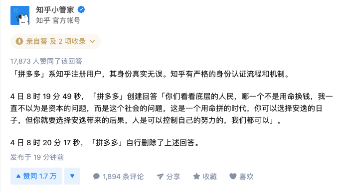 知乎表示,”拼多多“系知乎注册用户,其身份真实无误。知乎有严格的身份认证流程和机制。4日8时19分49秒,”拼多多“创建回答”你们看看底层的人民,哪一个不是用命换钱,我一直不以为是资本的问题,而是这个社会的问题,这是一个用命拼的时代,你可以选择安逸的日子,但你就要选择安逸带来的后果,人是可以控制自己的努力的,我们都可以。”4日8时20分17秒,“拼多多”自行删除了上述回答。