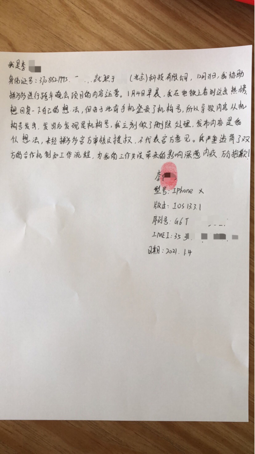 拼多多表示,该内容系拼多多品牌营销合作公司员工“李某某”编写发布。12月31日,该员工参与了拼多多跨年晚会的内容运营等合作营销任务,用手机登陆了拼多多的知乎官方账户,并保持了登陆状态。