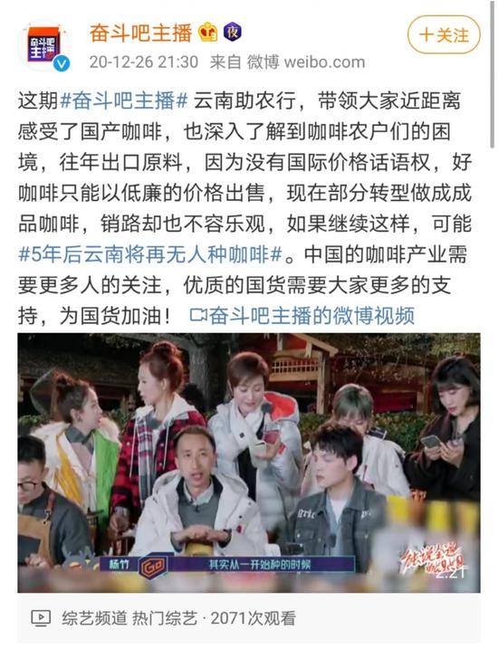 “ 因为没有国际话语权,(云南的)好咖啡只能以低廉的价格出售,现在部分转型做成品咖啡,销路却也不容乐观,如果继续这样,可能 5 年后云南将再无人种咖啡。”节目播出时,@奋斗吧主播 的官方微博发文称。