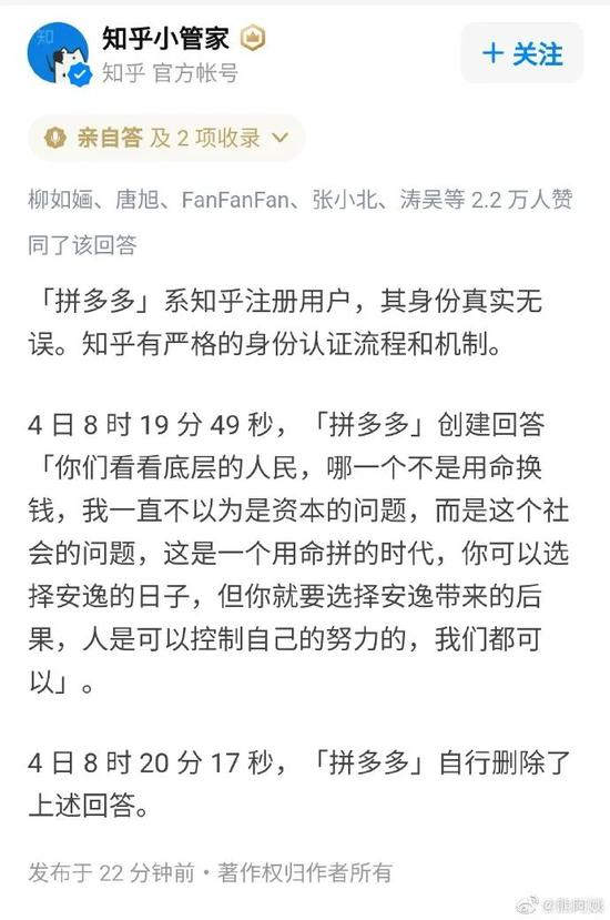 “底层人民,哪个不是拿命换钱。”网传一则毫无人味的回复,由拼多多的知乎官方认证账号发出,随后又秒删。