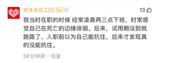 再回到暗处,当沉重的猝死事件,如石头一般砸向了看似平静的拼多多内部,不少“逃过了一劫”的拼多多员工也纷纷开始发出回声。