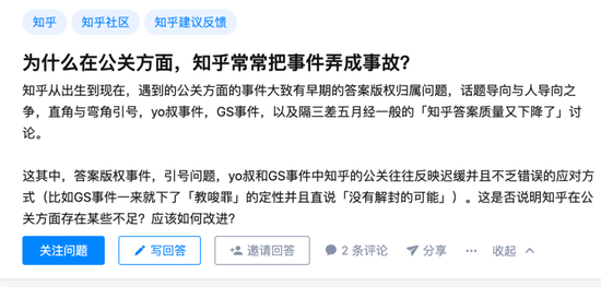 知乎里有一个问答是“为什么在公关方面,知乎常常把事件弄成事故?”。在这个问题的回答中,有人认为是因为知乎既不敢对用户内容完全放手,又不敢对于有些敏感内容痛下杀手。也有人认为是因为知乎的用户层决定的,“半罐水的知识分子是最难搞的”。