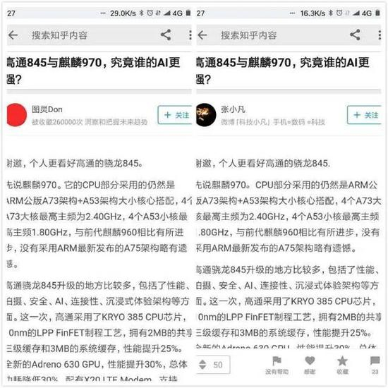 2017年12月24号,知乎上一则“高通845与麒麟970,究竟谁的AI更强?”的提问中,两位大V “图灵Don”与“张小凡”先后以谢邀的开头给出了几乎一模一样的答案,答案当然都是在捧高通。