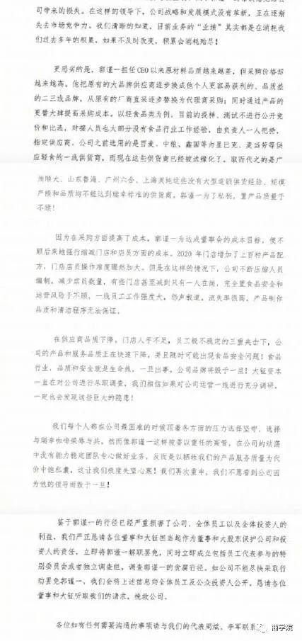 1月6日,有爆料称,瑞幸咖啡七位副总裁、所有分公司总经理和核心业务高管签署联名信,集体请求罢免瑞幸咖啡现任董事长、CEO郭谨一。