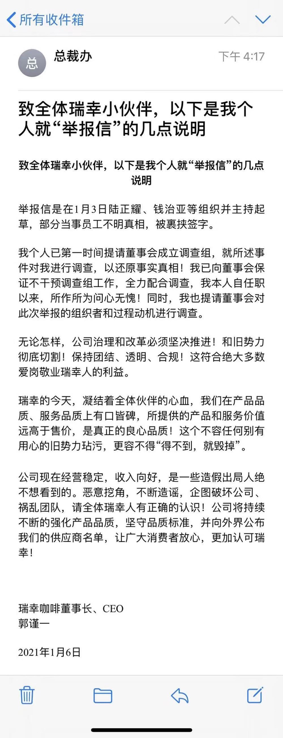 随后,瑞幸咖啡董事长、CEO郭谨一进行了回应。他表示,举报信是在1月3日陆正耀、钱治亚等组织并主持起草,部分当事员工不明真相,被裹挟签字。同时他还表示,“我本人自任职以来,所作所为问心无愧!同时,我也提请董事会对此次举报的组织者和过程动机进行调查。”