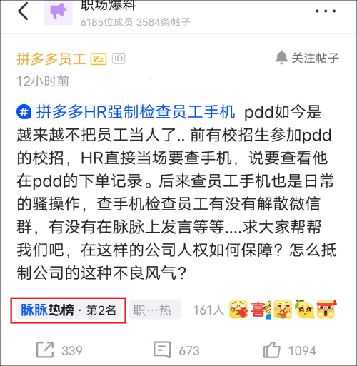 但在同一平台上,关于“拼多多HR强制检查员工手机”的讨论和批评并不少。