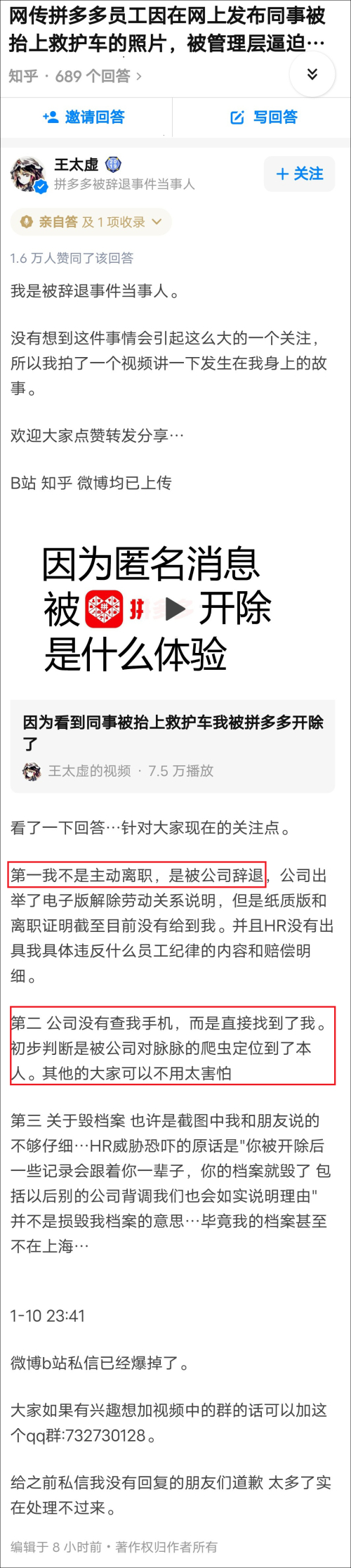 1月10日,自曝为当事人的网友@王太虚wray在微博、知乎和B站等多个网站上,发表真人出镜的说明视频,讲述了“救护车照片”事件的全过程。他同时谈到了拼多多存在大量加班、限制厕所坑位、办公环境恶劣、规章制度随意变化、缺乏员工关怀等问题。
