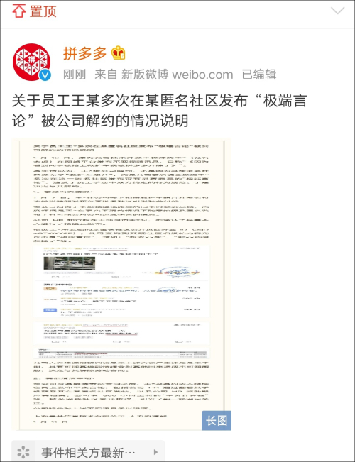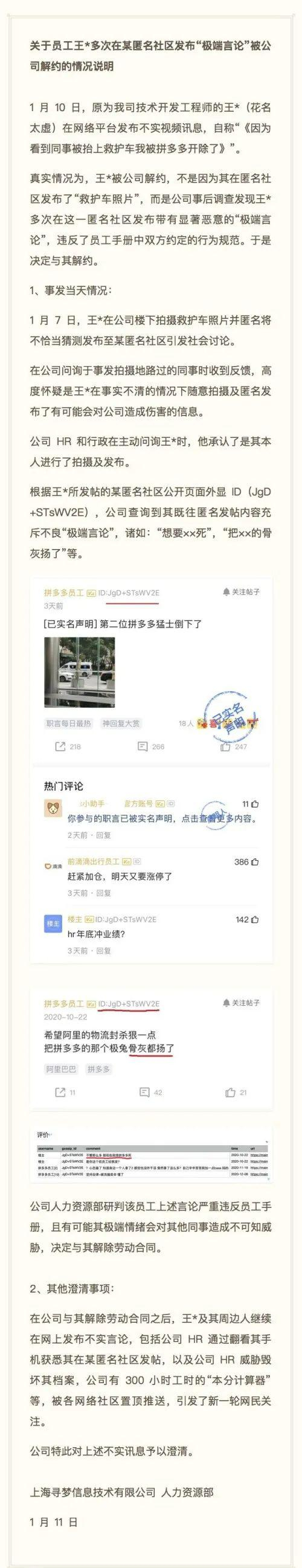 11日上午9时30分许,拼多多发表声明,指出@王太虚wray被解约的原因不是因为其在匿名社区发布“救护车照片”,而是公司事后调查发现@王太虚wray多次在该社区发布带有显著恶意的“极端言论”,违反了员工手册中双方约定的行为规范。