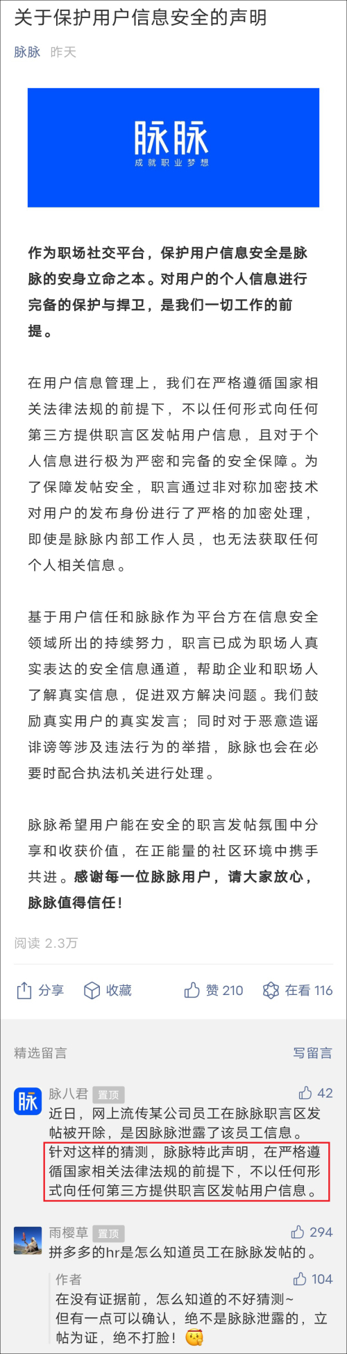 同日,脉脉在各大平台发表声明,表示他们会保护用户信息安全,不会外泄。