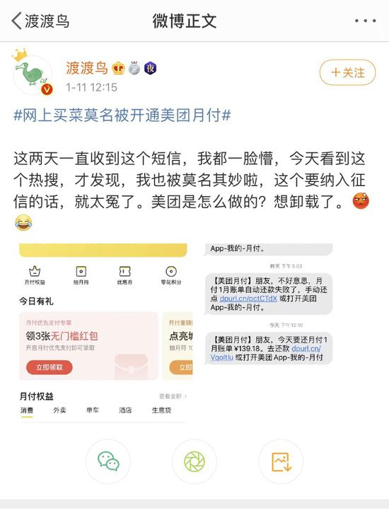 一位经过实名认证的微博大V“渡渡鸟”(《妈妈是什么》作者韩谨)表示,近几日收到美团月付的还款短信,才发现自己也莫名其妙开通了,并称“这个要纳入征信的话,就太冤了。”