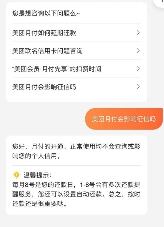 第一财经记者就此咨询美团人工客服,美团月付逾期还款是否会被纳入征信问题时,人工客服表示“月付不上报征信,逾期会有罚息。”