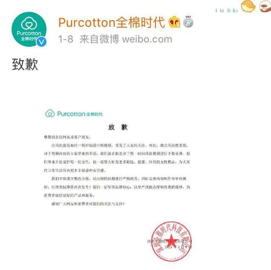 二、1月8日下午,全棉时代在自己的官方微博正式发布致歉信:目前公司已成立整改小组全面调查,这是内部的工作失误,目前已让不符合品牌标准、违背企业价值观的视频下线,并再次深表歉意。