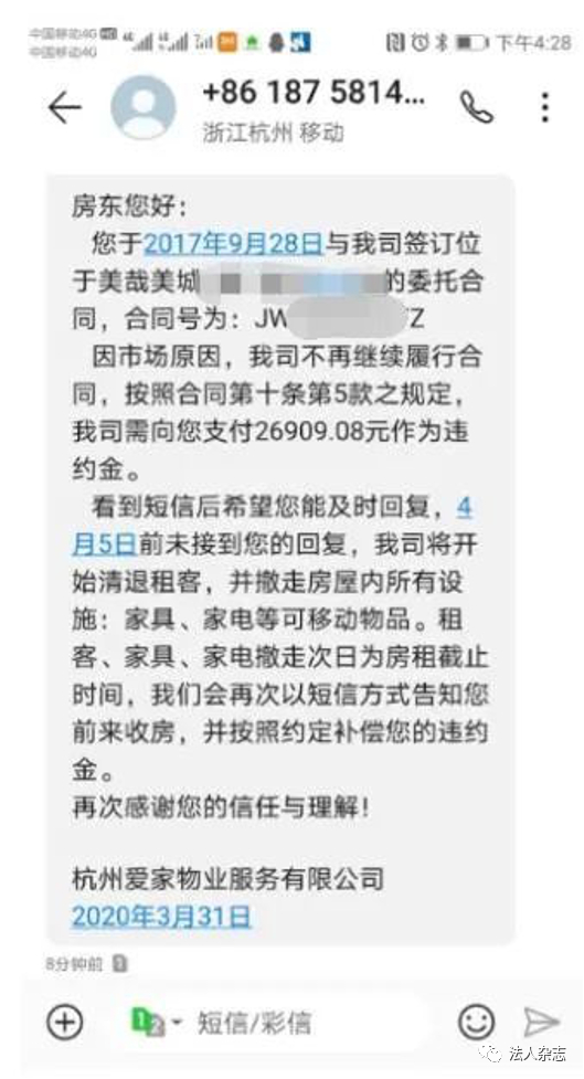 ▲我爱我家发出的违约短信通知