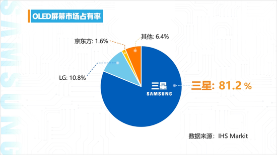 比如高端手机普遍使用的OLED屏幕,2019年四季度,三星市占率达到81.2%,同样来自韩国的LG为10.8%,京东方仅有1.6%。