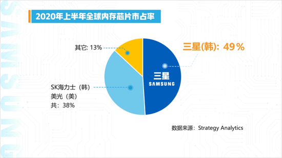 其中,三星是全球内存芯片的最大巨头,2020年上半年市占率达到了49%。而国内目前在内存芯片上仍处于起步阶段,完全没有可以拿来与三星比较的供应商。