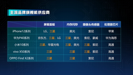我们知道,除了处理器芯片,智能手机核心元器件还有屏幕面板和内存芯片等。这是目前所有主流品牌旗舰机型在这两种元器件上的供应商名单,可以发现,三星的名字频频出现。