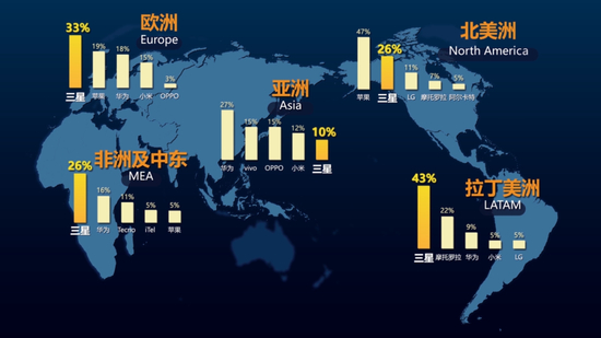 另外,三星可以说是唯一能通吃五大洲的手机品牌,通过各大洲的数据可以看到:在拉美非洲,性价比高的中国品牌销量不俗,价格更高的iPhone玩不转;而在欧洲和北美,则是苹果畅销,中国品牌往往表现一般。