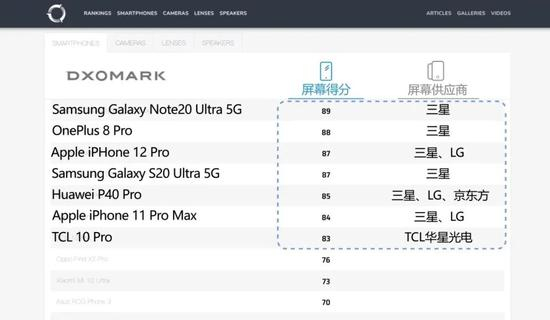 在国外专业机构的评分中,除TCL的一款手机外,所有屏幕得分80分以上的手机型号,使用的都是三星屏幕。