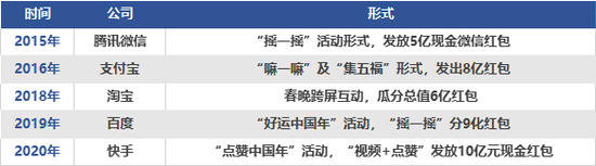 从2015年开始,互联网公司便开始以红包的形式抢占春晚这一最大的流量入口,红包金额也在不断水涨船高,快手在 2020 年春晚发出了 10 亿人民币的红包,超过百度的 9 亿、淘宝的 6 亿,成为史上最高红包数额。