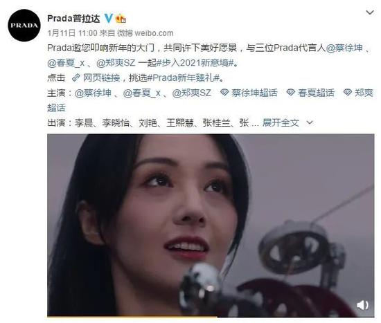 就在张恒发文引起舆论发酵的7天前,奢侈品牌普拉达(Prada)通过官方微博官宣三位品牌代言人,郑爽为其中之一。