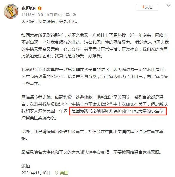 1月18日,郑爽前男友张恒在微博发文,辟谣网络上称其借高利贷、逃避债款等传闻,并称自己在美国“照顾并保护两个年幼无辜的小生命”。随后,有媒体公布了由张恒朋友提供的两份出生证明,文件显示,两个小孩的母亲现用法定姓名均是“SHUANG ZHENG”,父亲姓名则是“HENGZHANG”。上述爆料人还提供了一段录音,内容为疑似郑爽与郑爽父母和张恒父母之间关于如何处理孩子的对话。录音中,一方称“两个人分开了,谁也养不起,跟医院说一下,就弃养呗”,随后又提出将孩子生下后找人领养。