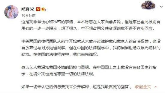 1月19日午间,郑爽发文称,“在中国国土之上我没有违背国家的指示,在境外我也更是尊重一切的法律法规”,并称从未放弃与对方沟通调解。
