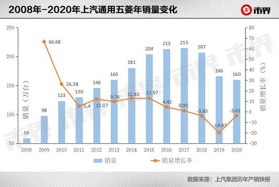 整体销量上,之前一直保持增长的上汽通用五菱,也自2018年开始出现销量下滑。2018年、2019年,上汽通用五菱销量分别同比下滑3.65%、19.62%,其中2019年销量由上一年的206万辆跌至166万辆。