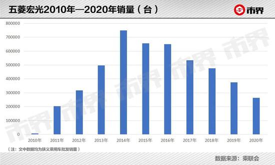 乘联会数据显示,2019年,上汽通用五菱宏光销量为37万辆,相比于2018年同比下滑了21%。在巅峰时期,这款车年销量曾突破75万辆。