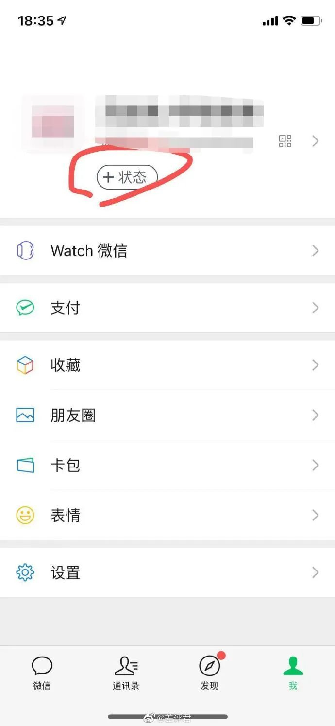 微信 8.0 版本支持设置 “我的状态”,包括 “心情想法”、“工作学习”、“活动”、“休息”与 “其他”几个部分。