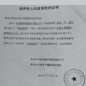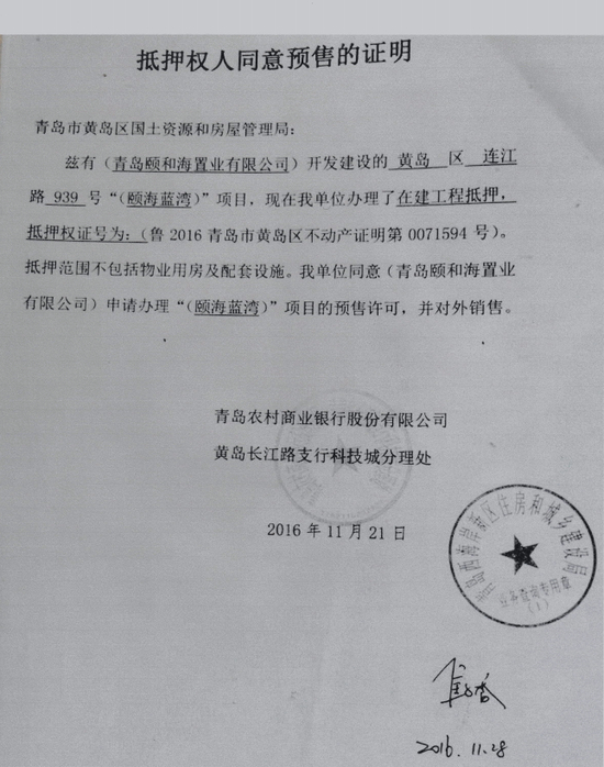 2016年,青岛农商银行黄岛长江路支行曾出具同意抵押范围内项目进行销售的证明