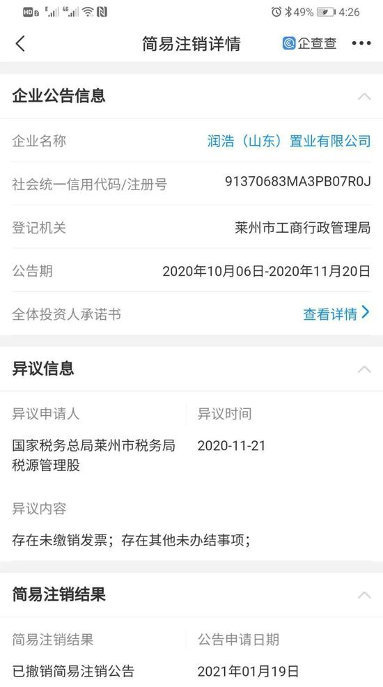 1月19日,记者通过企查查发现,该简易注销公告已被撤销。一名购房者认为,“该公司被撤销注销公告是一个好事,警方已经去莱州调查了。”