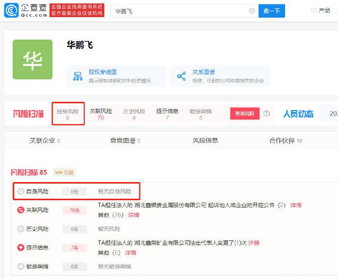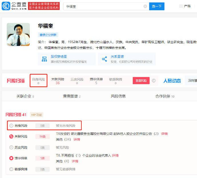 1月25日,企查查发布微博称,企查查APP显示,华晨宇、华福雄目前与湖北鑫银贵金属股份有限公司、湖北银矿、湖北鑫荣矿业有限公司无任何商业关联。企查查风险信息显示,华晨宇大伯华福奎、华晨宇哥哥华鹏飞自身风险均为0条。