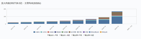 目前看,龙大肉食在垂直整合布局上仍有较大发展空间。当前公司以肉制品板块为核心板块,是基于以下三点考虑,第一,肉制品板块有更高的利润贡献水平,毛利率大大领先于贸易、屠宰、养殖板块;第二,肉制品板块在不同的周期(上行或下行)里保持稳定的利润贡献能力;第三,肉制品板块属于食品板块,而食品板块属于大消费的领域,公司认为这个领域有广阔的市场空间和良好的未来预期。但数据显示龙大肉食的肉制品板块营业收入占比极低,不足总营业收入的5%。同时虽然屠宰板块营收比例逐年下降,但肉制品板块营收并没有明显增长,反而逐渐缩减,与公司未来战略规划构想并不相符。