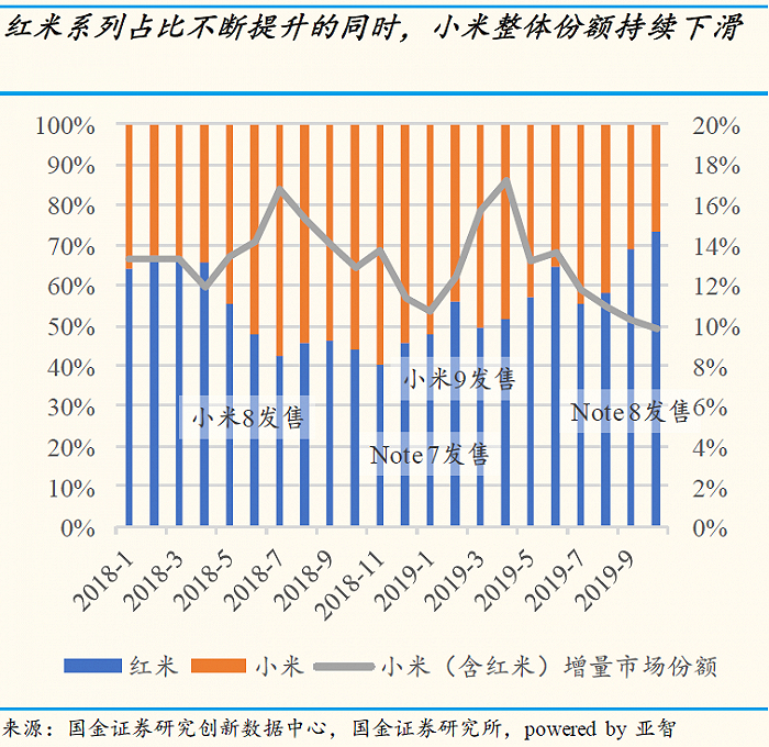 在K20热销的2019年,小米手机业务累计占有率含红米10.1%,累计同比增长含红米-25.1%。