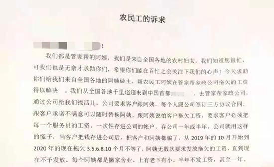 一封来自管家帮家政服务阿姨们的求助信显示,从2019年10月开始,国内家政服务平台企业管家帮拖欠其家政服务人员工资3-10个月不等,阿姨们多次讨要无果,诉苦无门。