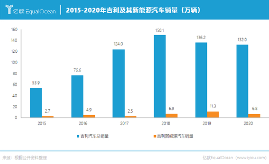 从销量来看,押注多个新能源汽车筹码的吉利,并未提交出一份亮眼的答卷。2020年,吉利全年销量为132.02万辆,夺得中国品牌乘用车销量第一。但在新能源车领域,销量仅为6.81万辆,同比下降66%,在总销量中仅占5.15%。