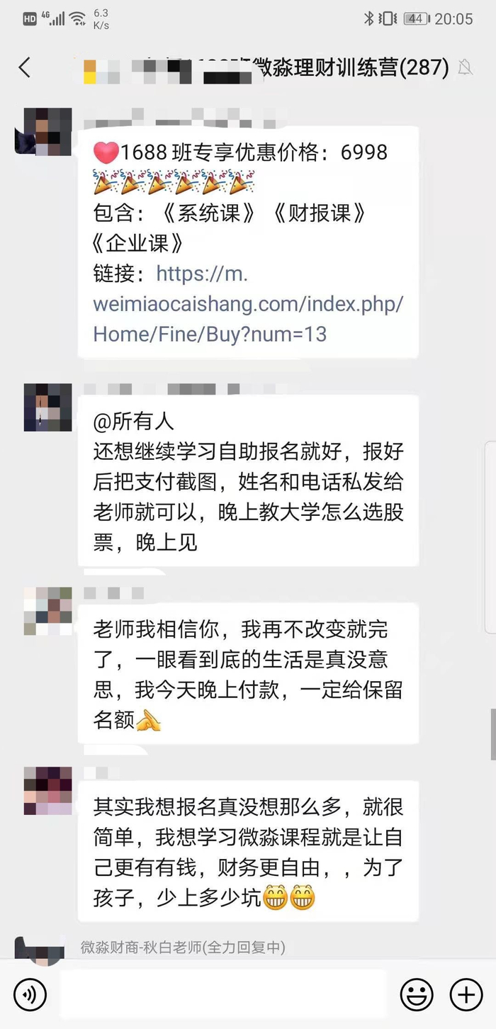 针对小白课程群中老师宣传高阶课程以及学费分期付款等问题,2月2日,微淼相关负责人回应新京报记者称,目前,微淼商学院的课程分为针对“零基础”理财人群的《小白训练营》课程和想要完善自己投资体系的进阶课程。可以将《小白营》看做进阶课的“入门砖”,学员在学完《小白营》后,教师会向学员宣传进阶课,而分期付款更是正常的社会现象,微淼商学院开设分期付款服务也是予用户方便,但是否选择分期付款的主动权与选择权完全在用户手中。