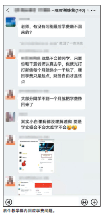 而为了打消学员觉得课程比较贵或者学不会的念头,财商课老师不时在群里发出老学员提到“投资已经赚回学费”的截图,并称“60多岁阿姨都能看懂”,“老师带过超万名同学,还没有说学不会的”,增强学员购课决心。