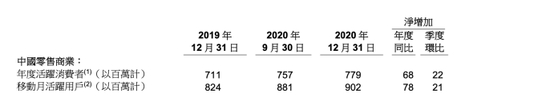 阿里的用户数在2020年有了明显提升,相对2019年末数据月活用户同比增长7800万。截止2020年12月31日,阿里年度活跃用户7.79亿,单季净增长2200万,月活用户9.02亿,较上季度增长2100万。