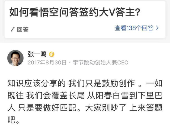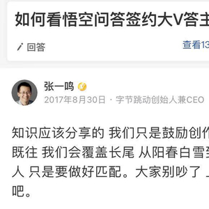 当初,在悟空问答挖知乎墙角的巨大争议中,张一鸣亲自站台助威。他在自己的悟空问答账号上这样写道:“知识应该分享的,我们只是鼓励创作。一如既往,我们会覆盖肠胃,从阳春白雪到下里巴人,知识要做好匹配。大家别吵了,上来答题吧。”
