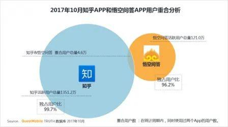 从用户构成上讲,悟空问答实际上找错了竞争对手,知乎与其在用户群上的重合度不足5万人。