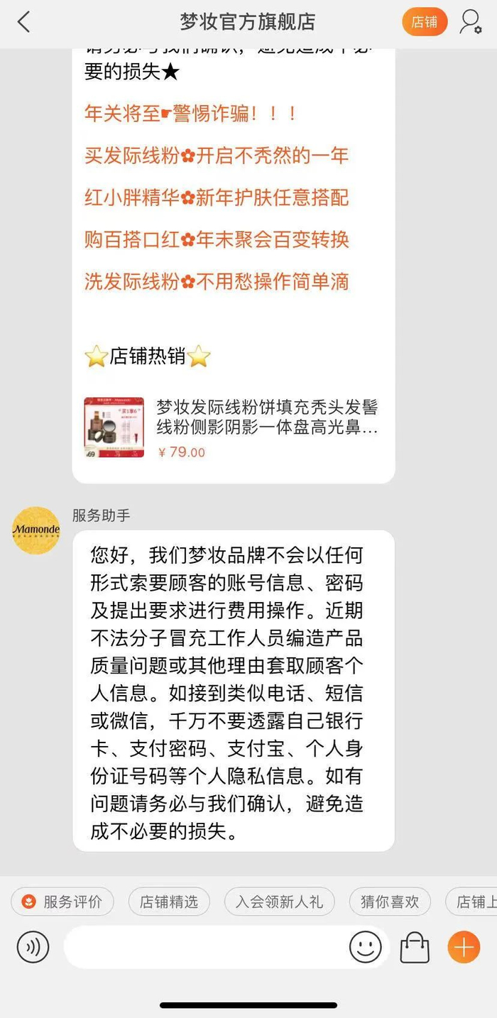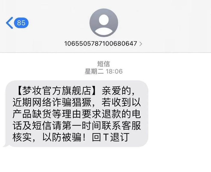 而两天之后,周小姐收到了一则来自梦妆旗舰店的短信,内容为“近期网络诈骗猖獗,若收到以产品缺货等理由要求退款的电话及短信请第一时间联系客服核实,以防被骗!”