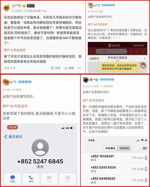无独有偶,《消费者报道》在梦妆天猫旗舰店搜索该款发际线粉的宝贝评论时发现,不少消费者均收到过类似的诈骗电话,诈骗分子所使用的手段如出一辙,消费者因此怀疑自己的个人信息被商家泄露。