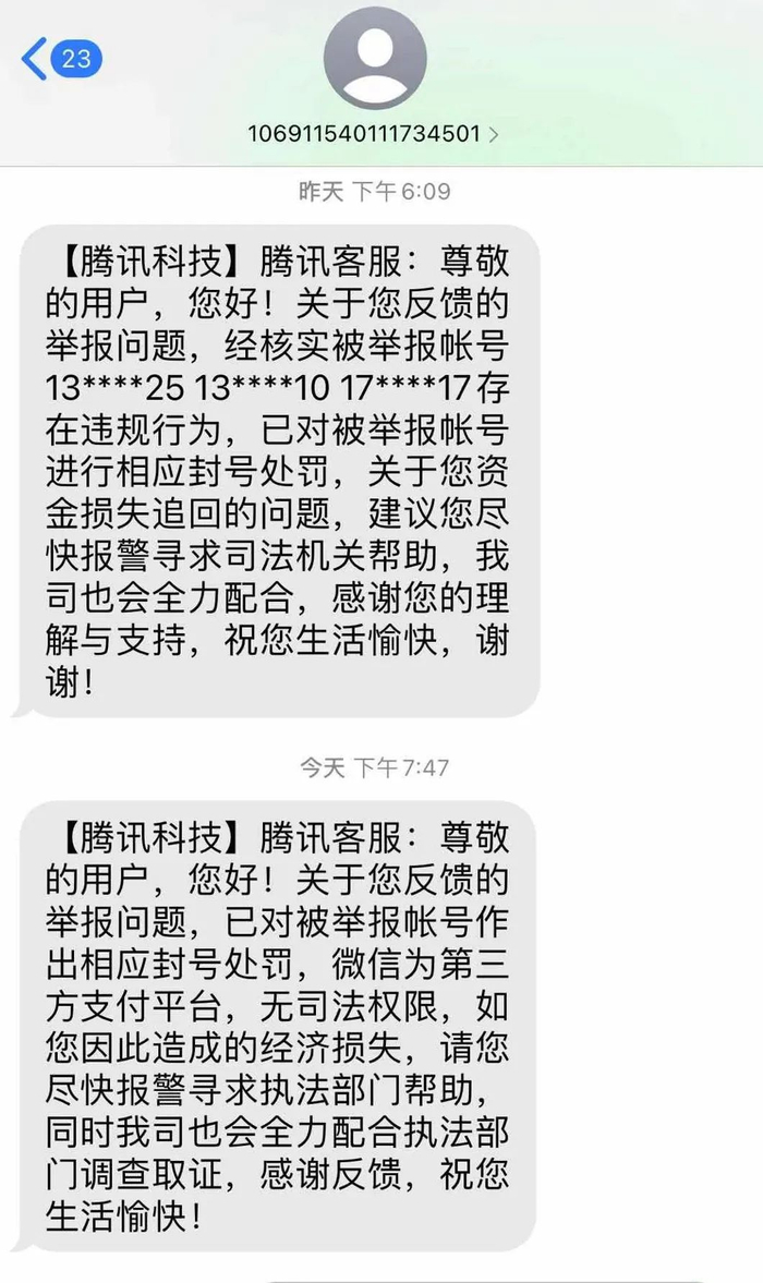 赵小姐于是拨打了腾讯客服电话就此事进行投诉,腾讯方面给出的回复是已对赵小姐举报的账号进行相应的封号处理。但关于资金损失追回的问题,腾讯方面无司法权限,建议赵小姐寻求司法机关帮助,并将配合执法部门调查取证。