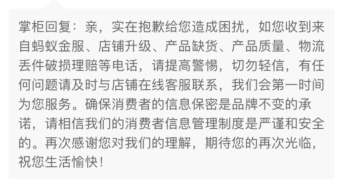 “近期不法分子冒充工作人员编造产品质量问题或其他理由套取顾客个人信息。如接到类似电话、短信或微信,千万不要透露自己银行卡、支付密码、支付宝、个人身份证号码等个人隐私信息。如有问题请务必与我们确认,避免造成不必要的损失。”该自动回复信息同时显示。
