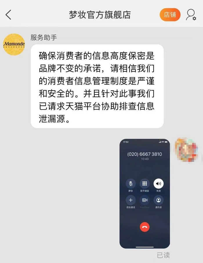 梦妆天猫旗舰店客服自动回复显示,目前已针对此事请求天猫平台协助排查信息泄露源。