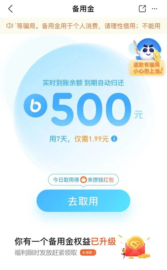 国家反诈中心提醒消费者,“备用金”是支付宝上的小额短期借款产品,可以申请放款到支付宝账户,满足小额应急的消费需求。“备用金”仅用于个人消费,无法用于存款或退款。任何声称退款、汇款进备用金账户的都是骗子。
