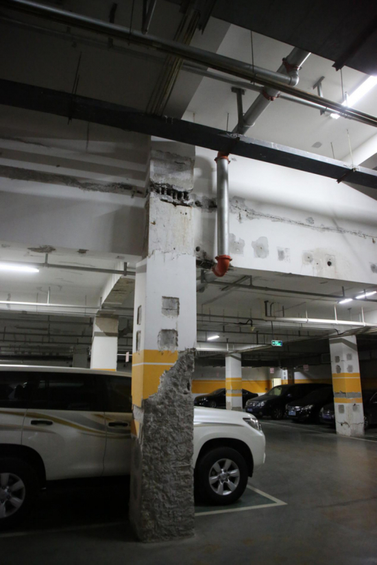 (在专业鉴定机构报告里,北京青龙湖国际会都指挥部办公楼的地下一层,多项安全性评估均为Deu,也就是最严重的整体“危房”级别 。李微敖 摄)