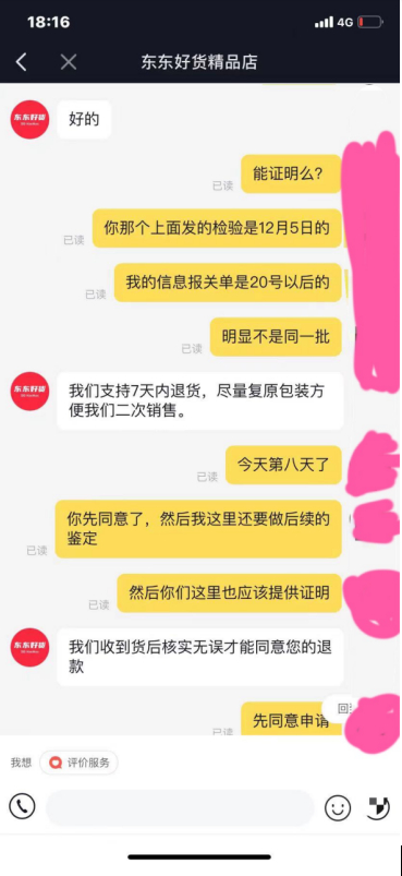 对此,客服表示同意李先生等买家选择7天无理由退货,但是并不同意他们以“假货”为由进行退货。